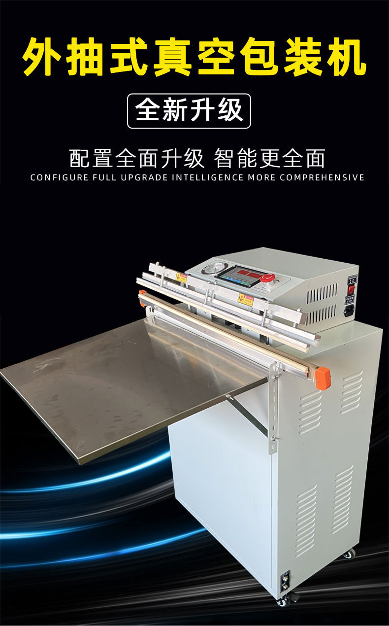 • 外抽式真空包裝機:把包裝袋放在真空室外的工作臺上,通過抽氣嘴伸入包裝袋內抽氣,同時利用熱封裝置對包裝袋進行封口,無需將產品放入真空室。