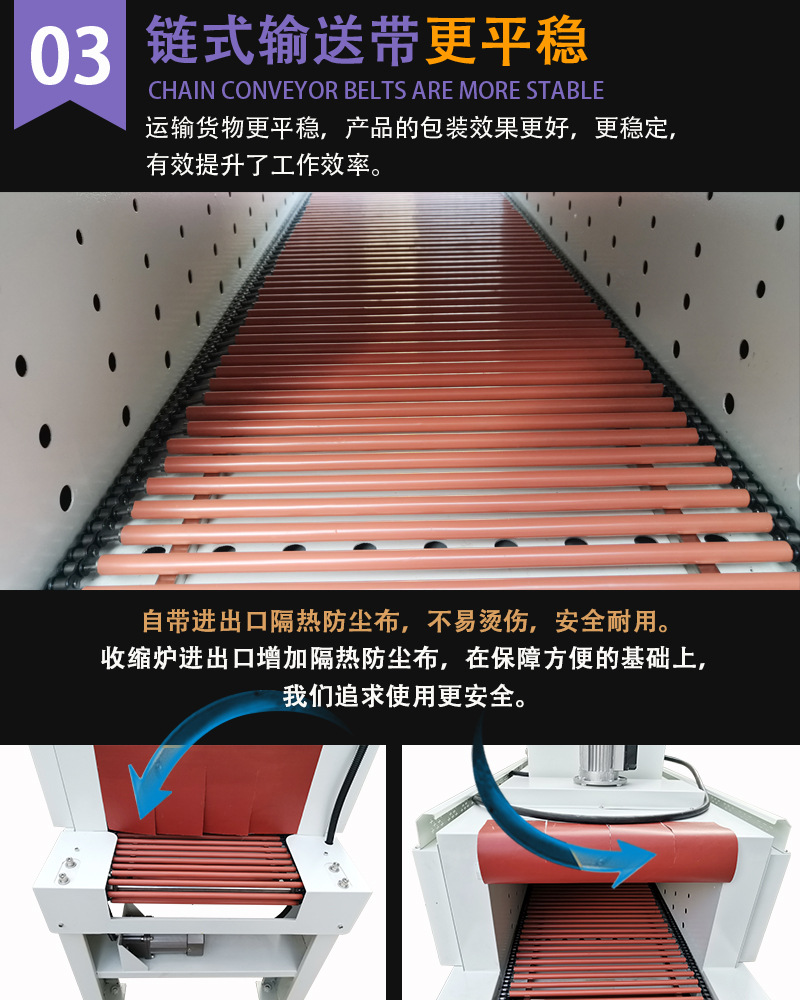 它的工作原理是利用熱收縮薄膜在受熱狀態(tài)下會(huì)收縮的特性,將產(chǎn)品用薄膜包裹后進(jìn)行加熱,使薄膜緊緊貼合在產(chǎn)品表面,從而達(dá)到包裝、保護(hù)和美化產(chǎn)品的目的。