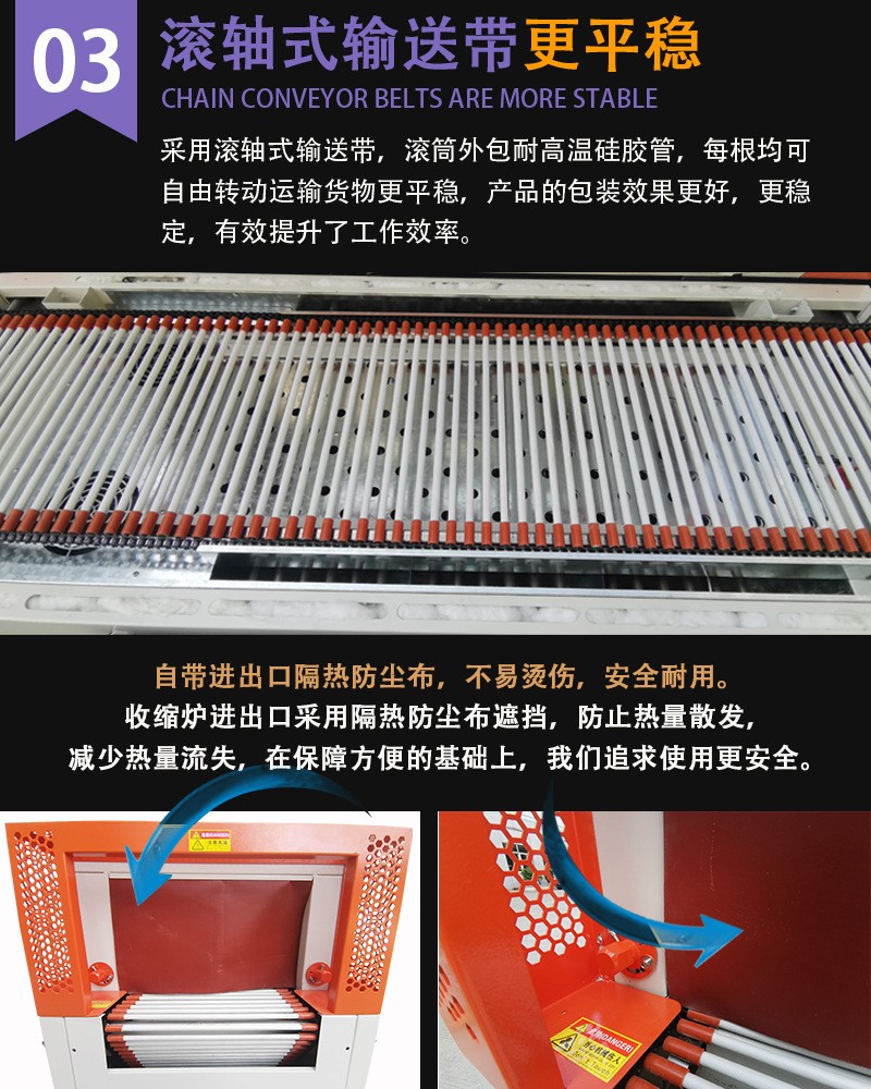 - 高速的輸送系統確保產品能夠連續不斷地進入熱收縮區域,進一步提升了包裝速度。一些熱收縮機的輸送速度可達到每分鐘數十米,滿足大規模生產的需求。