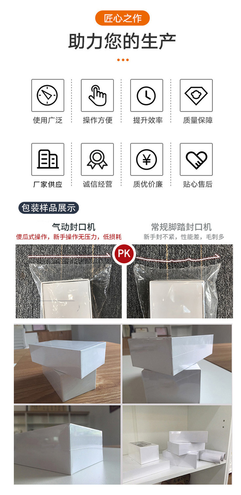 - 操作簡單:設備操作簡單,只需將包裝材料放置在封口位置,按下啟動按鈕即可完成封口操作。