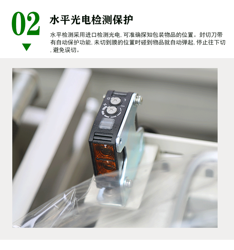 - 通過光電傳感器等設備對物品的位置、姿態等進行實時監測和精準定位。當物品到達預定位置時,會及時向控制系統發送信號,觸發后續的薄膜套膜、封切等操作,確保整個包裝過程的準確性和連貫性。