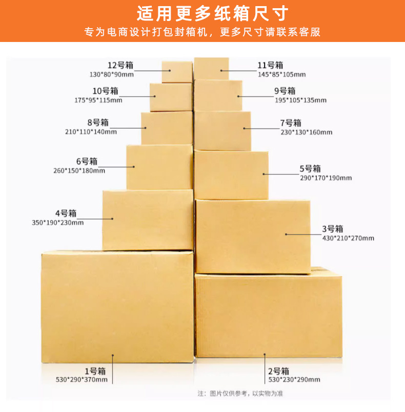 - 高速度封箱:自動封箱機具有較高的封箱速度,能夠大大提高包裝生產(chǎn)線的效率。一般來說,其封箱速度可以達(dá)到每分鐘 10 - 30 箱左右,具體速度取決于紙箱的大小、形狀以及機器的性能等因素。例如,在包裝小型的電商快遞紙箱時,封箱速度可能會更快,能夠快速地完成大量紙箱的封箱任務(wù)。