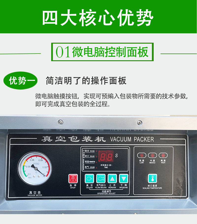 - 通過控制面板可以精確地設置真空度,能夠滿足不同產品對真空環(huán)境的要求。例如,對于一些對氧氣特別敏感的藥品,能夠將包裝袋內的真空度設置到較低水平,有效延長藥品的保質期。