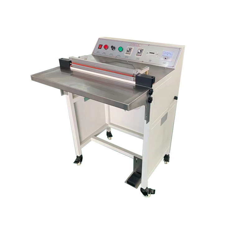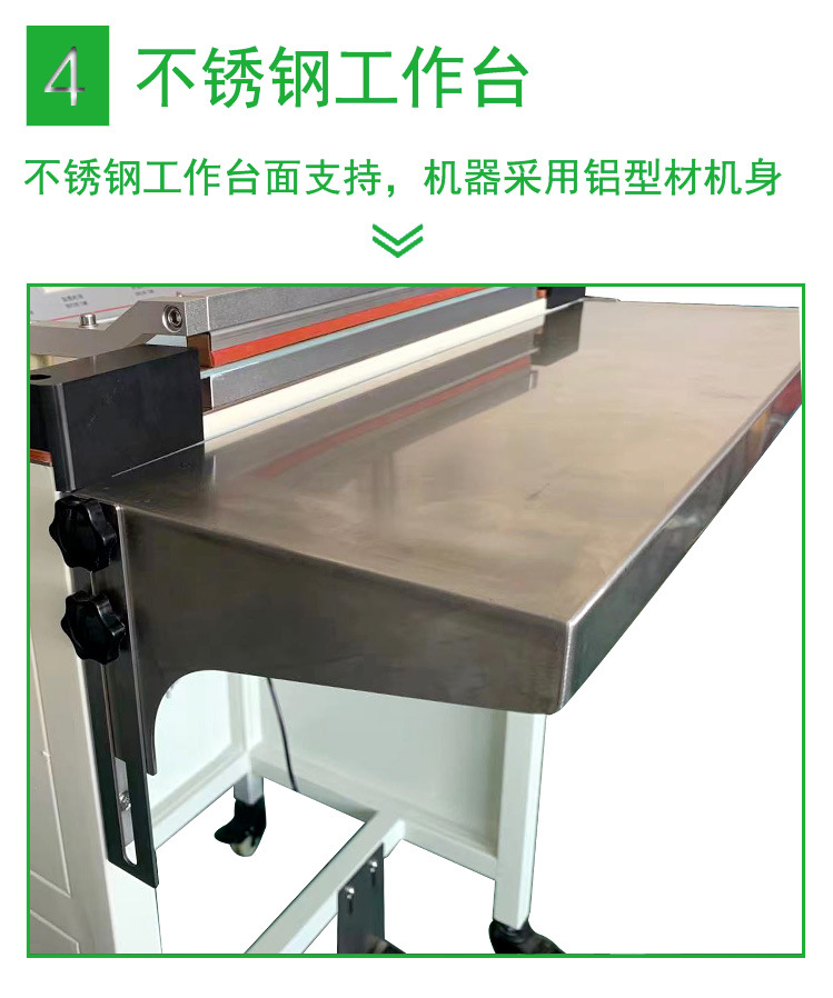 以常見的腳踏封口機為例,封口長度可達 450mm,封口寬度為 5MM,脈沖功率為 1.4KW,外形尺寸為 500×400×900mm 。
