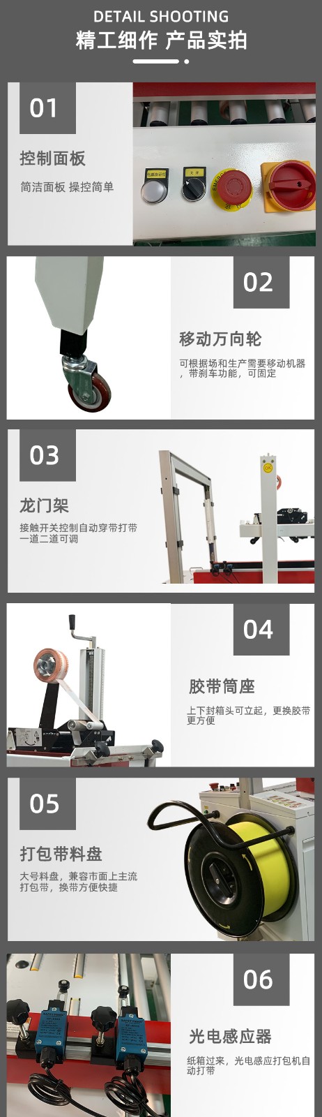 全自動封箱打包一體機,猶如一位不知疲倦且技藝精湛的包裝大師,在現代工業包裝領域展現出卓越的效能。其自動化連續作業模式,徹底革新了傳統包裝流程。設備啟動后,通過精密設計的輸送帶,平穩且快速地將待包裝紙箱源源不斷地輸送至封箱工位。在封箱環節,智能機械臂或高效皮帶裝置精準無誤地將紙箱上蓋與下蓋迅速折合,動作一氣呵成,緊接著膠帶粘貼裝置以極高的速度和精度,將膠帶整齊牢固地貼合在紙箱接縫處,完成完美封箱。封箱后的紙箱無縫銜接,即刻被輸送至打包工位。此時,打包機的穿帶機構如同靈動的舞者,敏捷地將打包帶準確無誤地穿過紙箱預設的打包位置,隨后拉緊機構瞬間發力,將打包帶緊緊束縛在紙箱上,最后通過熱熔或咬合機構,實現打包帶的穩固連接,整個過程流暢自然。