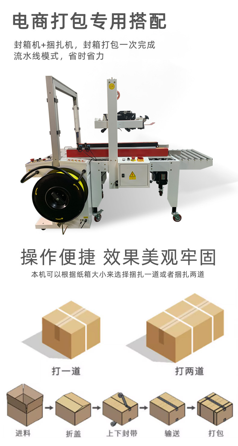 這一自動化連續作業模式,極大程度減少了人工操作的時間與勞動強度。以往,人工封箱時,工人需手動將紙箱蓋子逐一折合,再小心翼翼地粘貼膠帶,每完成一個紙箱的封箱,都需耗費一定時間,且頻繁重復性動作易使工人疲憊。而在打包環節,人工穿帶、拉緊、固定打包帶,不僅操作繁瑣,速度也極為有限。如今,有了全自動封箱打包一體機,工人只需將空紙箱放置在起始輸送帶上,后續工序均由設備自動完成。據實際數據統計,相較于傳統純人工包裝,使用該一體機后,包裝效率可提升數倍甚至數十倍。例如,在某電商倉庫,以往人工包裝每小時僅能完成幾十件紙箱的封箱打包,而引入全自動封箱打包一體機后,每小時可輕松處理數百件,顯著提升了整體包裝效率,使企業在單位時間內能夠完成更多訂單的包裝與發貨任務,極大增強了企業的市場競爭力