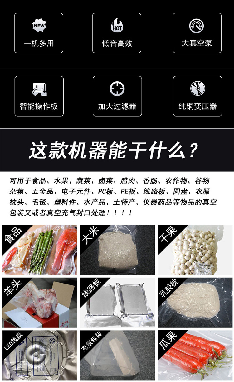 真空包裝機有廣泛的應用,但也有一定的局限性。簡而言之,真空包裝可用于食品、醫藥、中藥材、化工原料、金屬制品、電子、紡織、醫療器械等,其中大部分食品使用真空包裝。