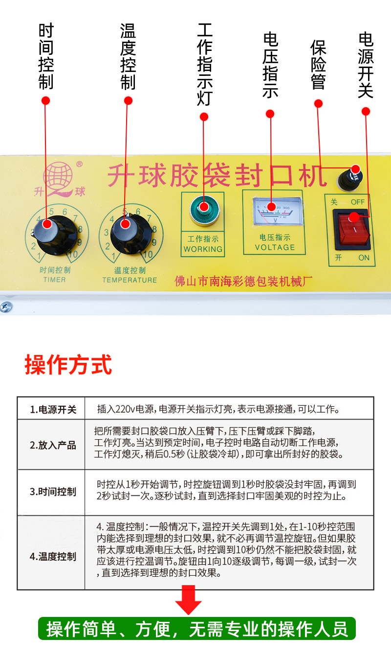 升球牌是根據國內外先進的機型基礎上,重新設計制造而成,適用于所有塑料袋薄膜封口及制袋,是食品廠,化妝品廠,藥廠等單位的理想封口設備。適用范圍 適用于醫藥,農藥,食品,日化,潤滑油等行業的鋁箔袋,塑料袋,復合袋理想封口機械