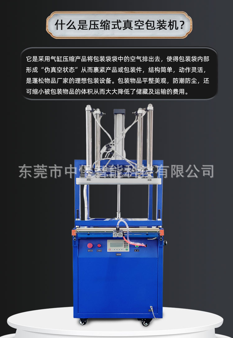 壓縮包裝機是一種用于減少物品體積和空間的包裝設備,?它通過不同的技術和原理,?如液壓、?熱縮、?真空等,?將物品壓縮以減小其體積,?從而節省存儲空間和運輸成本。?這種設備廣泛應用于各個行業,?包括但不限于食品、?紡織、?日化、?農業等。?